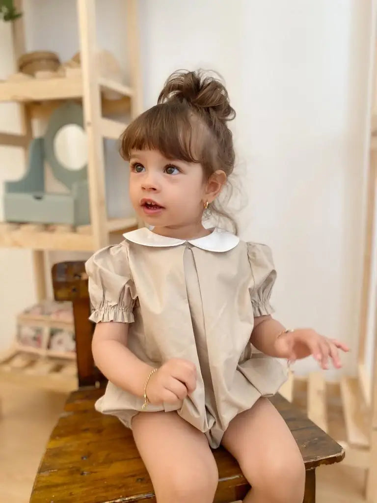 Featuring beautiful nude color and white baby collar detailed with buttons at buttom and at the back for an easy change. This look is elegant, comfortable and timeless