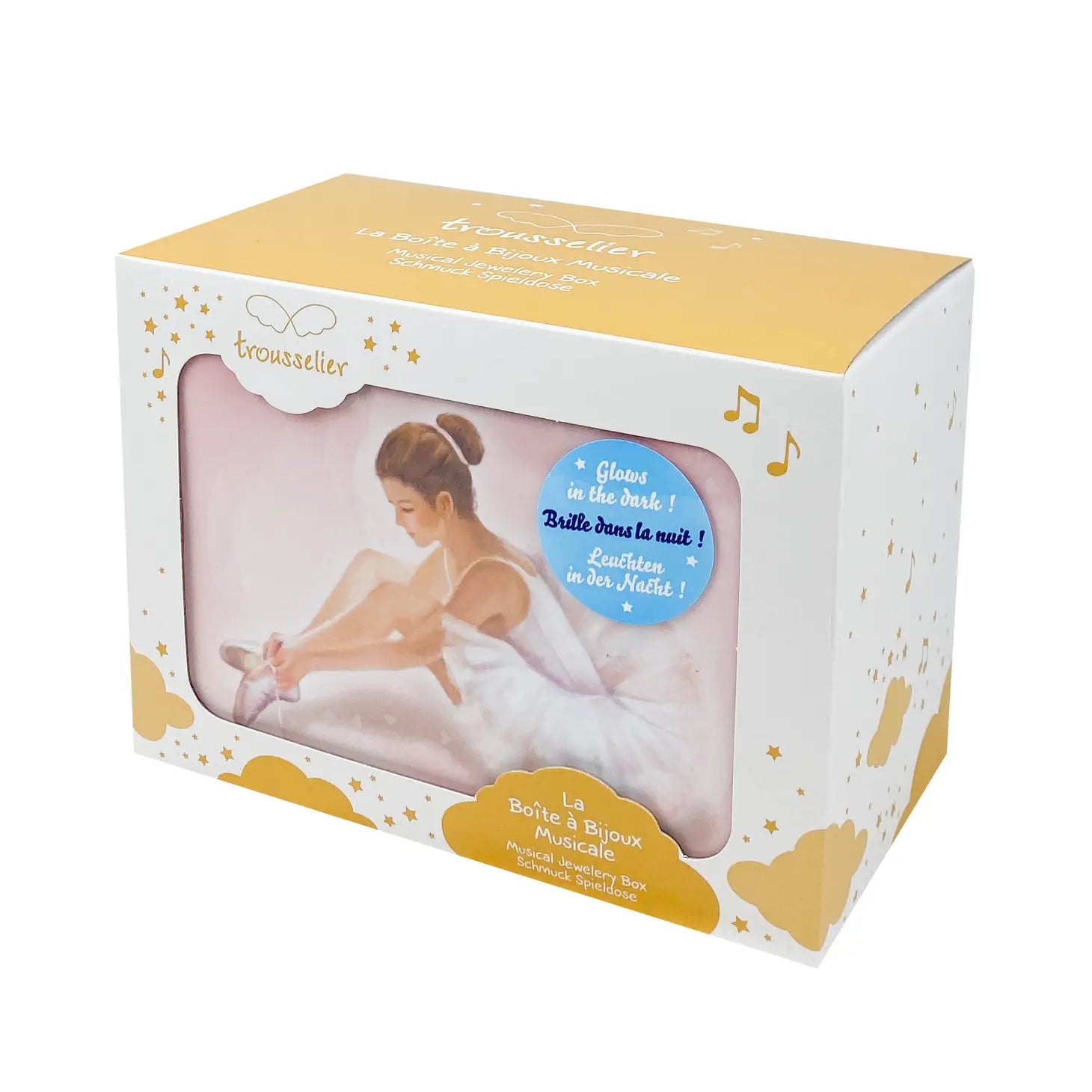 A MUSICAL BOX TO STORE TREASURES: This music box with a drawer, a large mirror and a ring sizer, will amaze the young girl who will store her treasures in it. MAGIC: Operate the crank and the figurine comes alive as if by magic to the sound of the music! IDEAL FROM BIRTH: This musical box will be of the most beautiful effect to decorate the child's room. An original birth gift full of poetry! TIMELESS: A music box is a timeless object that is treasured. His melody and the accompanying memories will remain etched in the child's memory for a long time. GLOW IN THE NIGHT: When charged with light, this musical box glows in the night. A reassuring little light in the secret of the sleeping room. A FAIRYTALE BRAND: Immerse yourself in the magical world of TROUSSELIER with their music boxes, night lights, comforters, musical mobiles & other toys that will rock the childhood of your little ones.