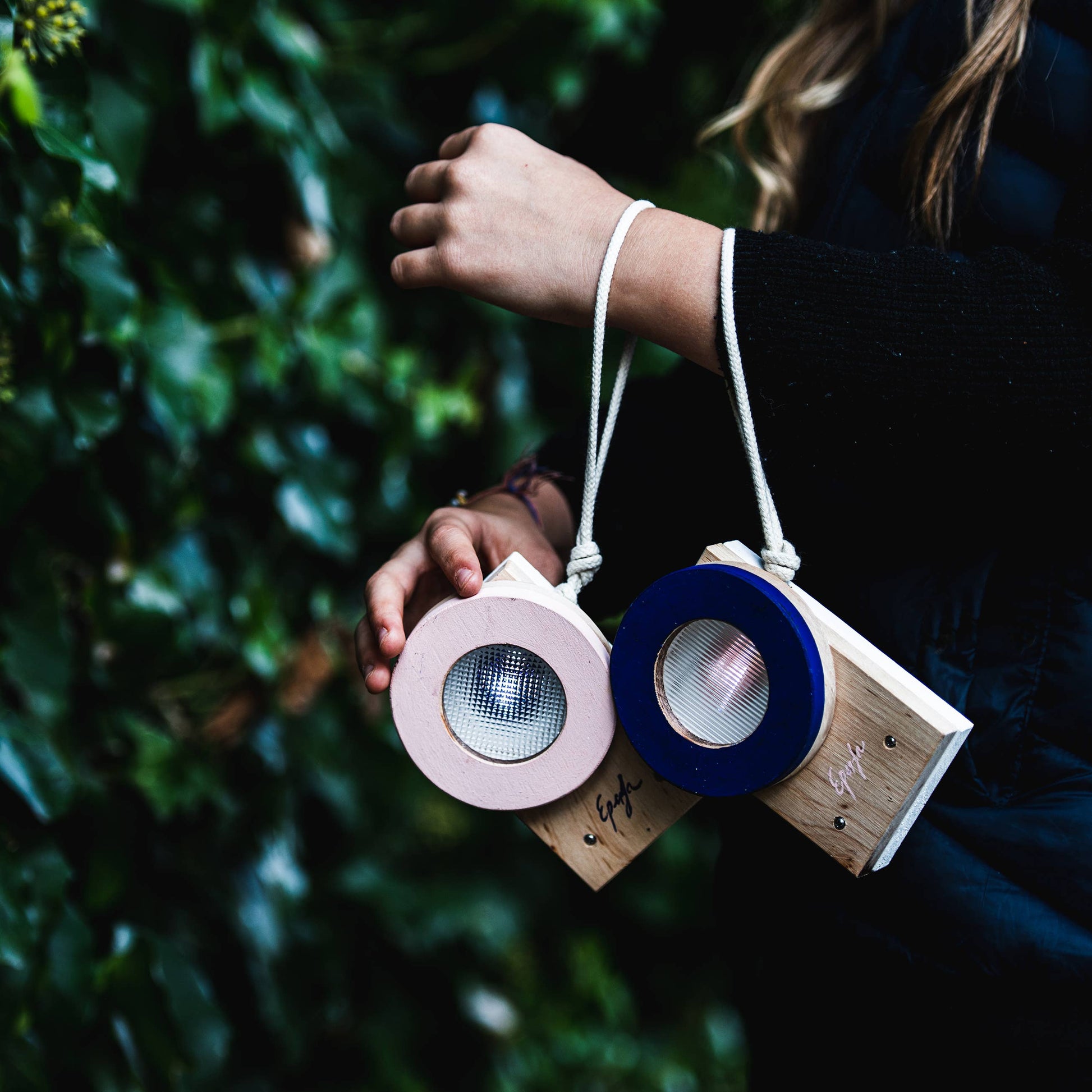 Material: alder wood, plexiglass lens, cotton rope.