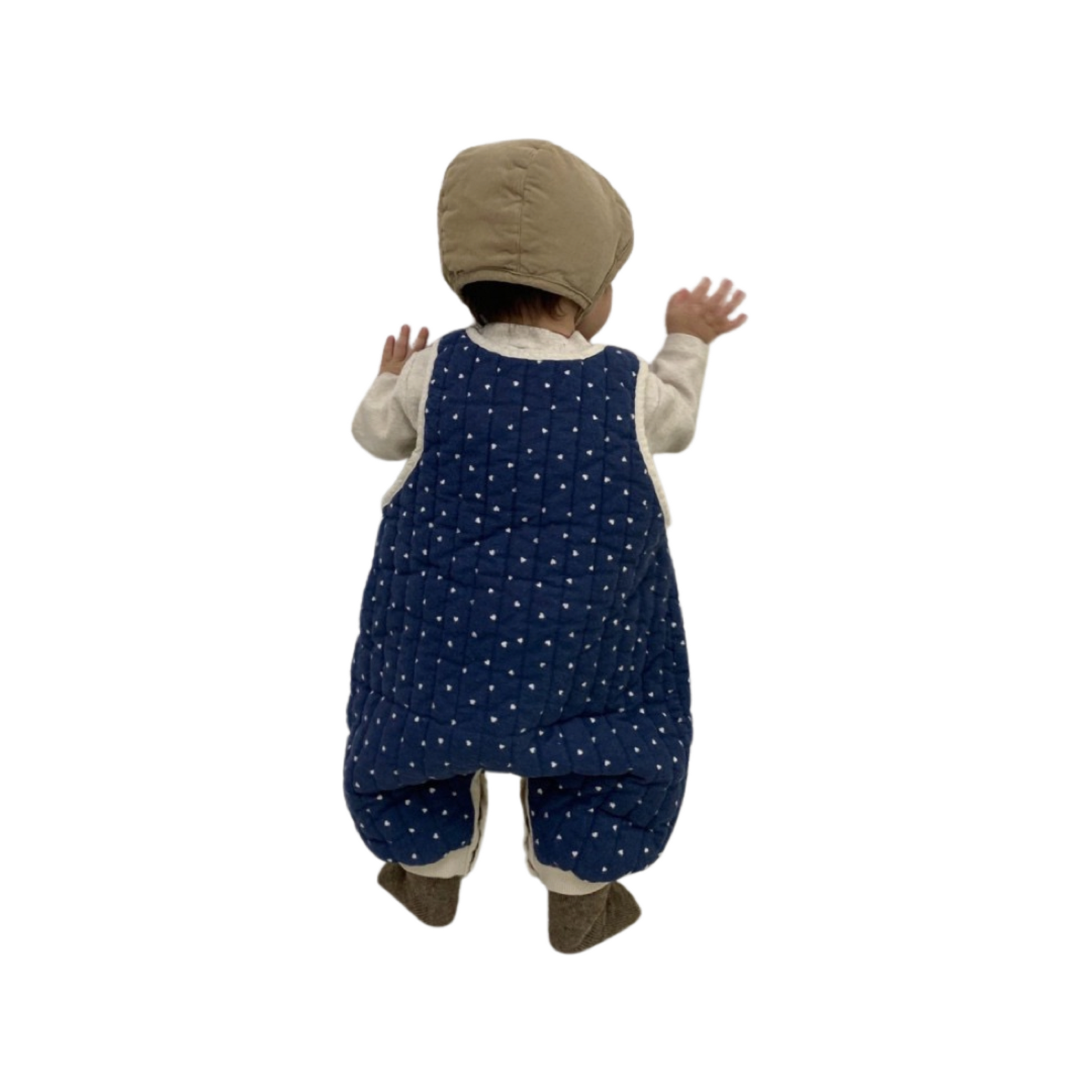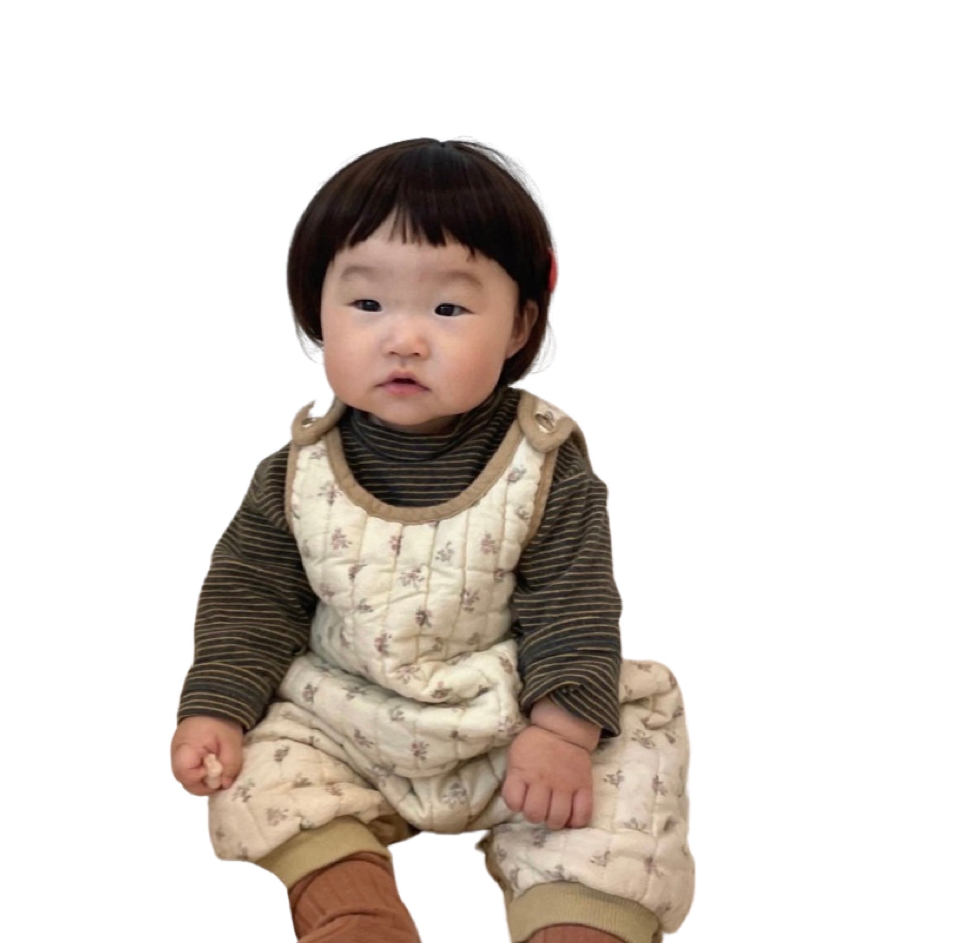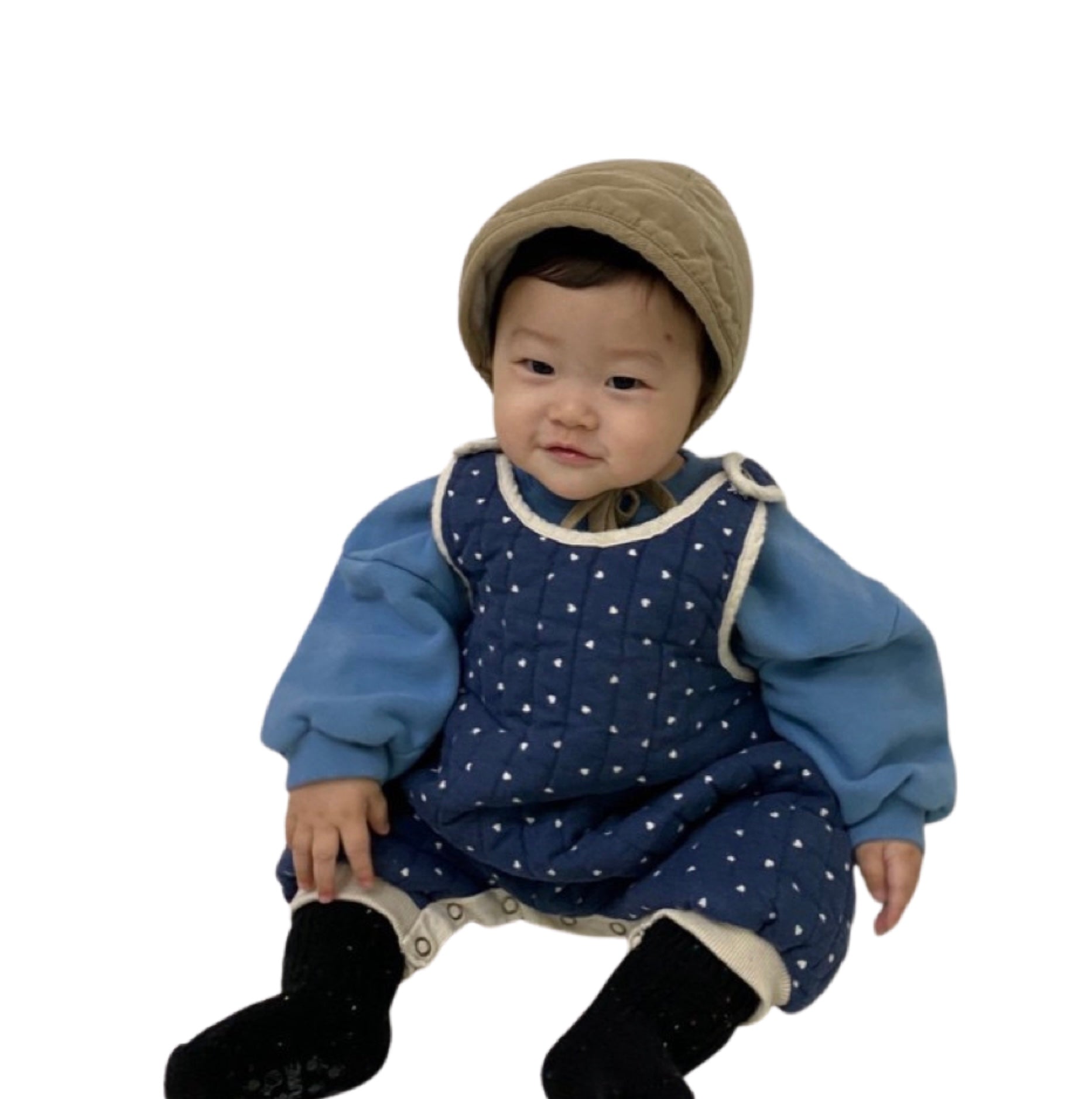 Great for colder weather, these soft quilted jumpsuits have snaps for easy diaper changes. Available in navy with small hearts or beige floral print.