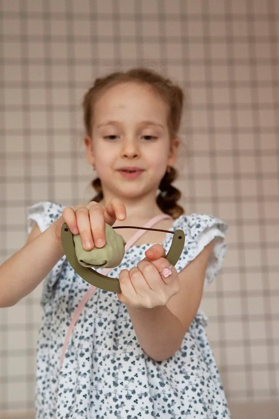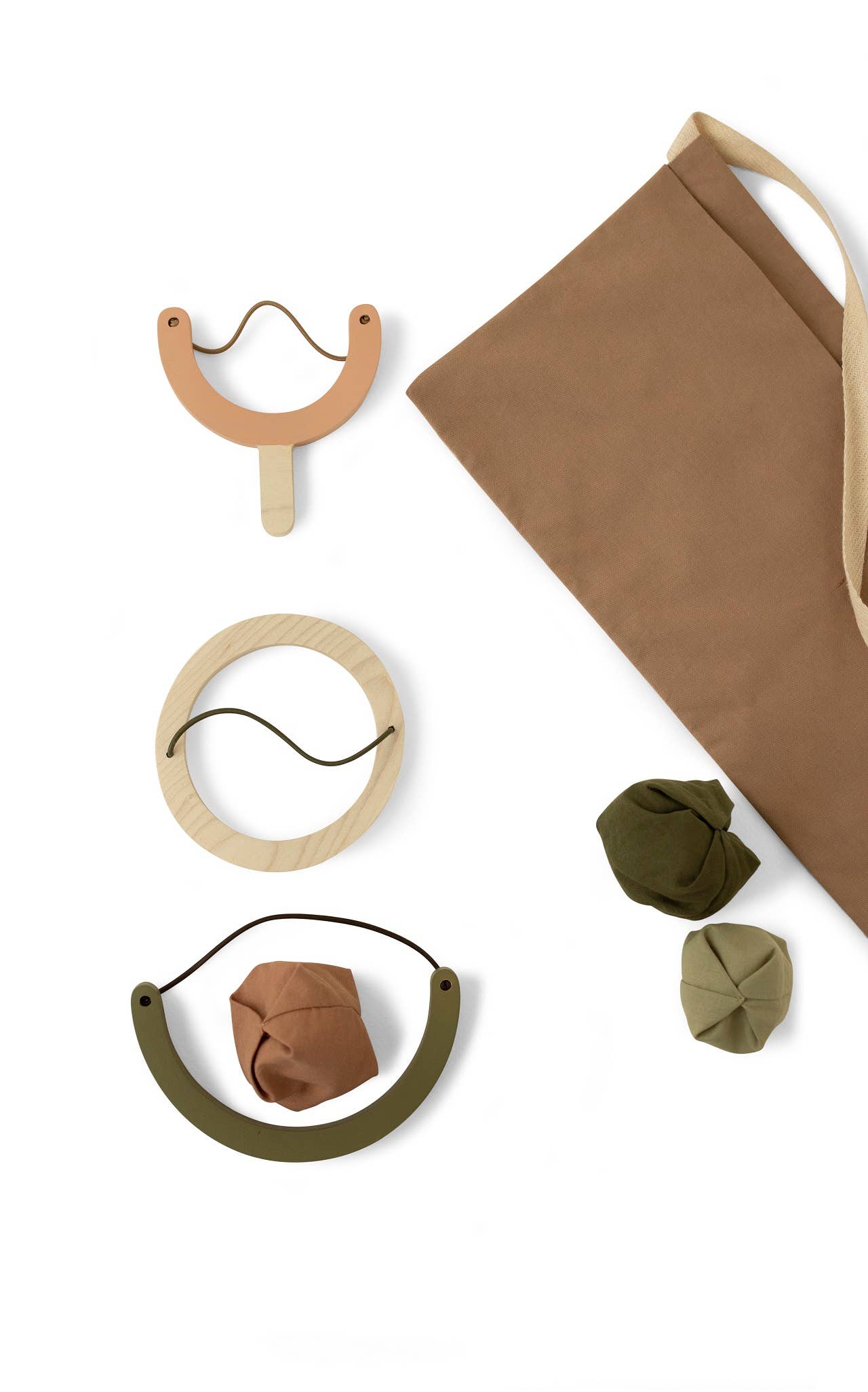 A fun way to develop motor skills, precision and dexterity. This game includes 3 different forms of slingshots, 3 different colors of cotton pellets and a cotton bag